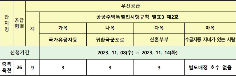 - 충북옥천 영구임대주택은 26A형 단일형으로 공급되며 금회 모집 인원수는 주거 약자용 포함 34명입니다.